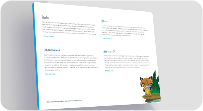 Fielo is loyalty and incentive automation made simple. Our Salesforce-native Loyalty ICIX delivers value chain transparency through the automation of data collection, and Incentives Clouds allow organisations of all sizes to modernise their programs collaboration with partners, and data analysis for risk, compliance, and ESG programs and bring the flexibility, power and cost advantages of digital to their critical loyalty to enhance stakeholder engagement for any business. This offers solutions for and incentive programs. Leading Salesforce customers rely on Fielo to create and sourcing, supply chain, sustainability / corporate social responsibility, finance / manage their channel incentives, customer loyalty, and employee incentives program. investor relations, and marketing / communications. Find out more > Find out more > Opti-Time for Salesforce is a Geoconcept field sales management application. Many enterprise businesses struggle to serve consumers effectively across multiple 100% integrated within the Sales Cloud environment, our engine has a reputation communication channels due to IT challenges. Our CPaaS platform, IMIconnect, for efficiency and performance thanks to its high degree of integration, its ability integrates with existing business systems to orchestrate customer communication to take into account numerous business constraints and to handle large volumes journeys across 10+ communication channels in a low-code, serverless environment. of data in record time. Our solution enables salespeople to access a powerful We enable businesses to deliver seamless end-to-end customer experiences whilst geo-optimisation platform: balancing portfolio, route optimisation and geo-planning reducing costs and improving efficiencies through automation. of sales appointments. Find out more > Find out more > EMEA ISV Industry Booklet – Consumer Packaged Goods