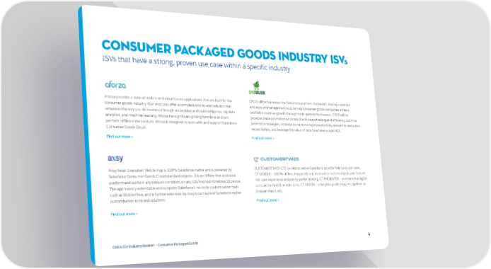 Consumer Packaged Goods Industry ISVs ISVs that have a strong, proven use case within a specific industry Aforza provides a suite of mobile and cloud based applications that are built for the CPGToolBox harnesses the Salesforce platform, the world’s leading customer consumer goods industry. Our products offer a complete end-to-end solution that and account management tool, to help consumer goods companies achieve enhances the way you do business through embedded artificial intelligence, big data profitable revenue growth through trade spend effectiveness. CPGToolBox analytics, and machine learning. Aforza has significant pricing functions and can provides trade promotion solutions that increase trade spend efficiency, optimise perform offline order capture. Aforza is designed to work with and support Salesforce promotion strategies, increase account manager productivity, streamline deduction Consumer Goods Cloud. reconciliation, and leverage the value of data to achieve a rapid ROI. Find out more > Find out more > Axsy Retail Execution Mobile App is 100% Salesforce-native and is powered by CUSTOMERTIMES (CT) publishes native Salesforce apps for field sales use cases. Salesforce Consumer Goods Cloud standard objects. It is an offline-first and cross CT MOBILE – 100% offline, it supports any standard or custom objects and features platform and works in any network condition, on any iOS/Android/Windows 10 device. rich user experience and penny-perfect pricing. CT PRESENTER – an interactive digital The app is easily extendable and supports Salesforce’s no-code customisation tools sales aid for field & remote visits. CT VISION – enterprise grade image recognition on such as Mobile Flow, and is further extended by Axsy’s own suite of Salesforce-native Einstein Vision, etc. customisation tools and solutions. Find out more > Find out more > EMEA ISV Industry Booklet – Consumer Packaged Goods 44