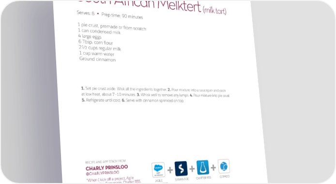 South African Melktert (milk tart) Serves: 8 Prep time: 90 minutes • 1 pie crust, premade or from scratch 1 can condensed milk 4 large eggs 1/3 cup chia seeds 6 Tbsp. corn flour 1/4 cup unsweetened cacao powder (or unsweetened cocoa powder) 21/2 cups regular milk 1/4 tsp. sea salt 1 cup warm water Ground cinnamon 11/2 cups nondairy milk such as almond or cashew milk 1/2 tsp. pure vanilla extract 1. Set pie crust aside. Wisk all the ingredients together. 2. Pour mixture into a saucepan and cook at low heat, about 7–10 minutes. 3. Whisk well to remove any lumps. 4. Pour mixture into pie crust. 5. Refrigerate until cold. 6. Serve with cinnamon sprinkled on top. RECIPE AND APP STACK FROM CHARLY PRINSLOO @CHARLYPRINSLOO + + + “When I kick off a project, Agile Accelerator, Samanage, Chatter RSS, AGILE SAMANAGE CHATTER RSS COPADO and Copado ensure my team is set ACCELERATOR up for success right at the start.” 25