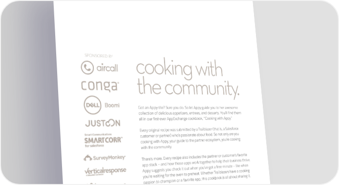 SPONSORED BY cooking with the community. Got an Appy-tite? Sure you do. So let Appy guide you to her awesome collection of delicious appetizers, entrees, and desserts. You’ll find them all in our first-ever AppExchange cookbook, “Cooking with Appy.” Every original recipe was submitted by a Trailblazer (that is, a Salesforce customer or partner) who’s passionate about food. So not only are you cooking with Appy, your guide to the partner ecosystem, you’re cooking with the community. There’s more. Every recipe also includes the partner or customer’s favorite app stack — and how those apps work together to help their business thrive. Appy suggests you check it out when you’ve got a free minute — like when you’re waiting for the oven to preheat. Whether Trailblazers have a cooking passion to champion or a favorite app, this cookbook is all about sharing it. Enjoy. 3