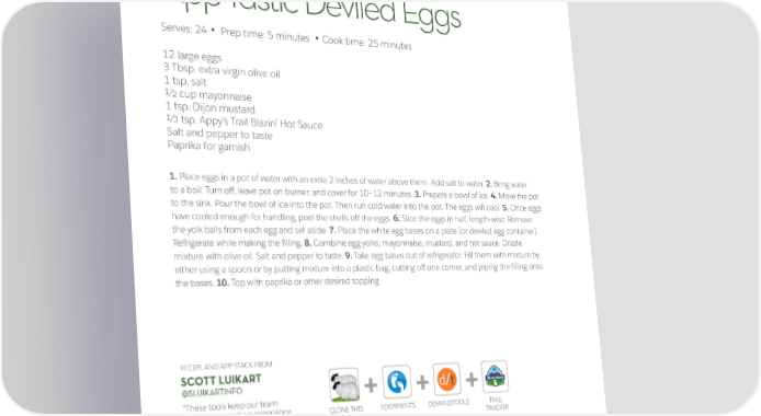 App-Tastic Deviled Eggs Serves: 24 Prep time: 5 minutes Cook time: 25 minutes • • 12 large eggs 3 Tbsp. extra virgin olive oil 1 tsp. salt ½ cup mayonnaise 1 tsp. Dijon mustard ½ tsp. Appy’s Trail Blazin’ Hot Sauce Salt and pepper to taste Paprika for garnish 1. Place eggs in a pot of water with an extra 2 inches of water above them. Add salt to water. 2. Bring water to a boil. Turn off, leave pot on burner, and cover for 10–12 minutes. 3. Prepare a bowl of ice. 4. Move the pot to the sink. Pour the bowl of ice into the pot. Then run cold water into the pot. The eggs will cool. 5. Once eggs have cooled enough for handling, peel the shells off the eggs. 6. Slice the eggs in half, length-wise. Remove the yolk balls from each egg and set aside. 7. Place the white egg bases on a plate (or deviled egg container). Refrigerate while making the filling. 8. Combine egg yolks, mayonnaise, mustard, and hot sauce. Drizzle mixture with olive oil. Salt and pepper to taste. 9. Take egg bases out of refrigerator. Fill them with mixture by either using a spoon or by putting mixture into a plastic bag, cutting off one corner, and piping the filling onto the bases. 10. Top with paprika or other desired topping. RECIPE AND APP STACK FROM SCOTT LUIKART @SLUIKARTINFO + + + “These tools keep our team humming — and we experience CLONE THIS FOOTPRINTS DEMANDTOOLS TRAIL amazing efficiency — without adding USER TRACKER any admins to support our users.” 8