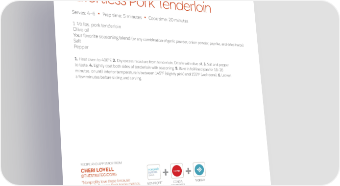Effortless Pork Tenderloin Serves: 4–6 Prep time: 5 minutes Cook time: 20 minutes • • 1 1/2 lbs. pork tenderloin Olive oil Your favorite seasoning blend (or any combination of garlic powder, onion powder, paprika, and dried herbs) Salt Pepper 1/2 red onion, thinly sliced 1. Heat oven to 400°F. 2. Dry excess moisture from tenderloin. Drizzle with olive oil. 3. Salt and pepper to taste. 4. Lightly coat both sides of tenderloin with seasoning. 5. Bake in foil-lined pan for 18–20 minutes, or until interior temperature is between 145°F (slightly pink) and 155°F (well-done). 6. Let rest a few minutes before slicing and serving. RECIPE AND APP STACK FROM CHERI LOVELL nonprofit @THESTRATEGICORG success pack + + “Nonprofits love these because Nonprofit Success Pack tracks metrics, NONPROFIT CONGA TASKRAY Conga Composer thanks donors, SUCCESS PACK COMPOSER and TaskRay manages projects.” 16