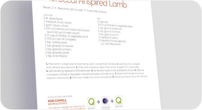 Moroccan-Inspired Lamb Serves: 2 Prep time: 28 minutes Cook time: 8 hours • • LAMB STEW RICE 1 lb. diced lamb 1 cup rice 1 medium onion, sliced 11/4 cup chicken or vegetable stock 2 garlic cloves, sliced 1 tsp. ground cinnamon 1 (24-oz.) tomato and sweet red pepper 1 tsp. ground turmeric sauce (or just tomato sauce) 1 tsp. ground cumin 1/2 tsp. salt 11/4 cup of chicken or vegetable stock 1 handful of raisins 1 (15-oz.) can of chickpeas 1 handful of dried apricots, 2 tsp. harissa paste cut into little pieces 1 tsp. ground cinnamon 1 tsp. ground turmeric 1 tsp. ground cumin 1 tsp. dried thyme 1. Place lamb in a large bowl and add harissa paste. Coat lamb well. Put aside. 2. Gently fry onions and garlic until softened, then add lamb. 3. Once lamb is browned, place lamb, onions, and garlic into a slow cooker. 4. Add remaining ingredients of the lamb stew. 5. Set the slow cooker on low, and leave for 8 hours. 6. Place rice in a steamer. Instead of using water, mix stock and spices, then add to rice. 7. Steam for 25 minutes (or per your steamer’s instructions). 8. Once rice is ready, mix in raisins and apricots. 9. Gently pour stew on top of rice, and serve. RECIPE AND APP STACK FROM ROB COWELL TM TM @ROBSALESFORCE + + “Our admins manage role hierarchy with Draggin’ Role, default campaign statuses DRAGGIN’ AAKONSULT FIELD TRIP with AAKonsult, and run reports on field ROLE CAMPAIGN usage with Field Trip.” STATUS 20