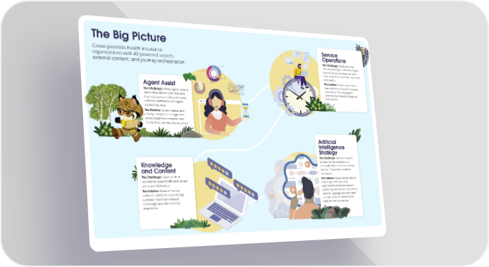 The Big Picture Service Coveo provides health insurance Operations organizations with AI-powered search, The Challenge: Roadblocks like external content, and journey orchestration. slow onboarding or a lack of analytics around service processes can slow case resolutions and hinder cross-sells and upsells. The Solution: Coveo helps reduce Agent Assist case resolution time and increases revenue by measuring agent The Challenge: When agents have to and member interactions against spend time searching for the data benchmarks. they need across multiple windows, customer satisfaction and agent productivity drop. The Solution: Coveo indexes and displays analytics in a single view allowing agents to improve case handle time and boost productivity. Artificial Intelligence Strategy The Challenge: Members expect Knowledge answers to their questions, on their preferred channel, in a timely and Content manner. The solution needs to The Challenge: Siloed content be scalable. repositories make it difficult to access The Solution: Coveo moves beyond and share information. simple typo tolerance and The Solution: Coveo enhances spell-check to fine-tune relevant customer satisfaction by building content by permissions, role, device, a unified index that makes all location, language, and even past knowledge available in a single behavior, fully orchestrating the experience. customer service journey.