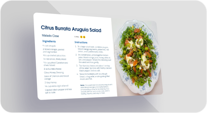 Citrus Burrata Arugula Salad Veg GF 15 Mins Malado Cisse Ingredients Instructions 1. In a large salad bowl, combine arugula, 4 cups arugula blood orange segments, pistachios, red 2 blood oranges, peeled onion, and Castelvetrano olives. and segmented 2. In a small bowl, whisk together lemon ½ cup shelled pistachios juice, blood orange juice, honey, olive oil, ¼ red onion, thinly sliced salt, and pepper. Drizzle the dressing over the salad and toss gently. ½ cup pitted Castelvetrano olives halved 3. Tear burrata cheese and place it on top of the salad. Sprinkle with freshly cracked 8 oz burrata cheese black pepper and sea salt. Citrus Honey Dressing: 4. Serve immediately with sourdough Juice of 1 lemon and blood bread, a baguette, or alongside grilled orange meats and ûsh. 2 tbsp honey Note: This salad balances peppery arugula with ¼ cup extra virgin olive oil sweet blood oranges and creamy burrata, Cracked black pepper and sea enhanced by a citrus honey dressing. It's a salt to taste versatile dish for lunch or as a side, and it's healthy, üavorful, and easy to make.