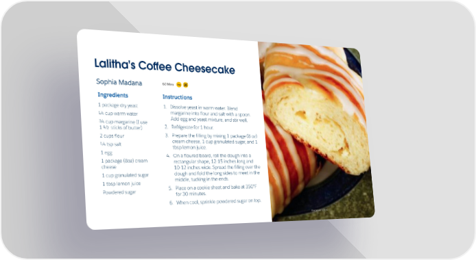 Lalitha's Coûee Cheesecake Veg 60 Mins Sophia Madana Ingredients Instructions 1 package dry yeast 1. Dissolve yeast in warm water. Blend margarine into üour and salt with a spoon. ¼ cup warm water Add egg and yeast mixture, and stir well. ¾ cup margarine (I use 2. Refrigerate for 1 hour. 1 ½ sticks of butter) 3. Prepare the ûlling by mixing 1 package (8 oz) 2 cups üour cream cheese, 1 cup granulated sugar, and 1 ¼ tsp salt tbsp lemon juice. 1 egg 4. On a üoured board, roll the dough into a 1 package (8oz) cream rectangular shape, 12-15 inches long and cheese 10-12 inches wide. Spread the ûlling over the dough and fold the long sides to meet in the 1 cup granulated sugar middle, tucking in the ends. 1 tbsp lemon juice 5. Place on a cookie sheet and bake at 350°F Powdered sugar for 30 minutes. 6. When cool, sprinkle powdered sugar on top. Fleichmann's Yeast