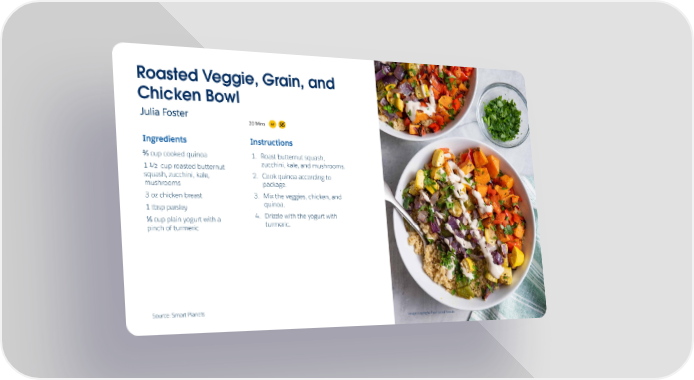 Roasted Veggie, Grain, and Chicken Bowl Julia Foster GF 20 Mins Ingredients Instructions 1. Roast butternut squash, t cup cooked quinoa zucchini, kale, and mushrooms. 1 ½ cup roasted butternut 2. Cook quinoa according to squash, zucchini, kale, package. mushrooms 3. Mix the veggies, chicken, and 3 oz chicken breast quinoa. 1 tbsp parsley 4. Drizzle with the yogurt with s cup plain yogurt with a turmeric. pinch of turmeric Source: Smart Planets Image copyright: Feel Good Foodie