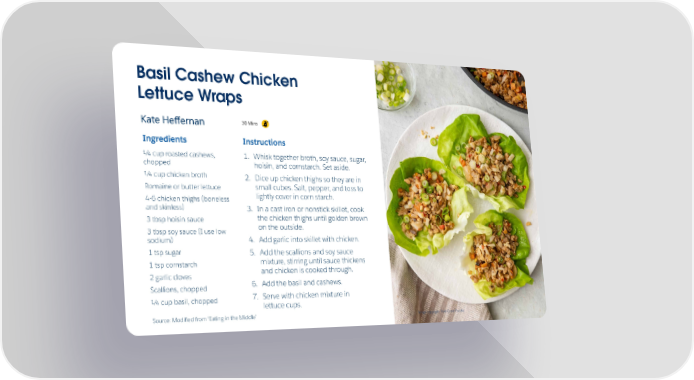 Basil Cashew Chicken Lettuce Wraps 30 Mins Kate Heûernan Ingredients Instructions ¼ cup roasted cashews, 1. Whisk together broth, soy sauce, sugar, chopped hoisin, and cornstarch. Set aside. ¼ cup chicken broth 2. Dice up chicken thighs so they are in small cubes. Salt, pepper, and toss to Romaine or butter lettuce lightly cover in corn starch. 4-6 chicken thighs (boneless and skinless) 3. In a cast iron or nonstick skillet, cook the chicken thighs until golden brown 3 tbsp hoisin sauce on the outside. 3 tbsp soy sauce (I use low sodium) 4. Add garlic into skillet with chicken. 1 tsp sugar 5. Add the scallions and soy sauce mixture, stirring until sauce thickens 1 tsp cornstarch and chicken is cooked through. 2 garlic cloves 6. Add the basil and cashews. Scallions, chopped 7. Serve with chicken mixture in ¼ cup basil, chopped lettuce cups. Source: Modiûed from 8Eating in the Middle9 Image copyright: Feel Good Foodie
