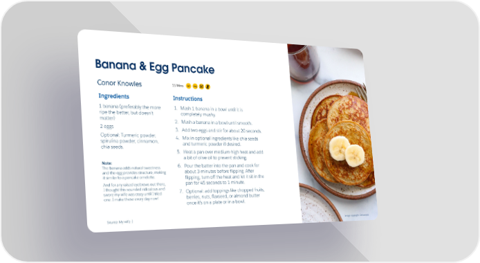 Banana & Egg Pancake Veg GF 15 Mins Conor Knowles Ingredients Instructions 1 banana (preferably the more 1. Mash 1 banana in a bowl until it is ripe the better, but doesn9t completely mushy. matter) 2. Mash a banana in a bowl until smooth. 2 eggs 3. Add two eggs and stir for about 20 seconds. Optional: Turmeric powder, 4. Mix in optional ingredients like chia seeds spirulina powder, cinnamon, and turmeric powder if desired. chia seeds. 5. Heat a pan over medium-high heat and add a bit of olive oil to prevent sticking. Note: 6. Pour the batter into the pan and cook for The banana adds natural sweetness about 3 minutes before üipping. After and the egg provides structure, making it similar to a pancake omelette. üipping, turn oû the heat and let it sit in the pan for 45 seconds to 1 minute. And for any raised eyebrows out there, I thought this sounded ridiculous and 7. Optional: add toppings like chopped fruits, swore my wife was crazy until I tried berries, nuts, üaxseed, or almond butter one. I make these every day now! once it's on a plate or in a bowl. Source: My wife :) Image copyright: Detoxinsta