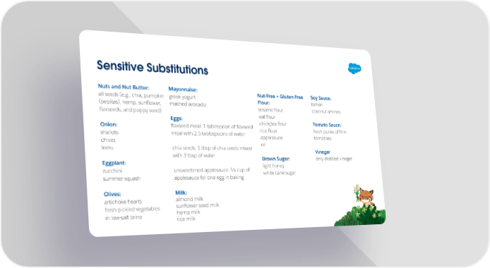 Sensitive Substitutions Nuts and Nut Butter: Mayonnaise: Nut-Free + Gluten Free Soy Sauce: all seeds (e.g., chia, pumpkin greek yogurt Flour: tamari (pepitas), hemp, sunüower, mashed avocado sesame üour coconut aminos üaxseeds, and poppy seed) oat üour Eggs: chickpea üour Tomato Sauce: Onion: üaxseed meal: 1 tablespoon of üaxseed rice üour fresh purée of ûrm shallots meal with 2.5 tablespoons of water applesauce tomatoes chives oil leeks chia seeds: 1 tbsp of chia seeds mixed Vinegar with 3 tbsp of water Brown Sugar: only distilled vinegar Eggplant: light honey zucchini unsweetened applesauce: ¼ cup of white cane sugar summer squash applesauce for one egg in baking Olives: Milk: almond milk artichoke hearts sunüower seed milk fresh pickled vegetables hemp milk in low-salt brine rice milk