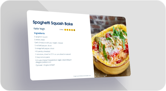 Spaghetti Squash Bake GF K V 30 Mins Katie Yeigh Ingredients 1 spaghetti squash 1 onion, diced Garlic (measure with your heart), minced 1 red bell pepper, diced 1 orange bell pepper, diced 4-6 carrots, shredded 4 tomatoes, diced (or 2 14-oz cans diced tomatoes) 2 tbsp tomato paste 1.5 cups cheese (mozzarella or vegan, depending on allergies/preferences) Optional: 1 lb ground beef Image source thebrownstonebaker.com Note: information