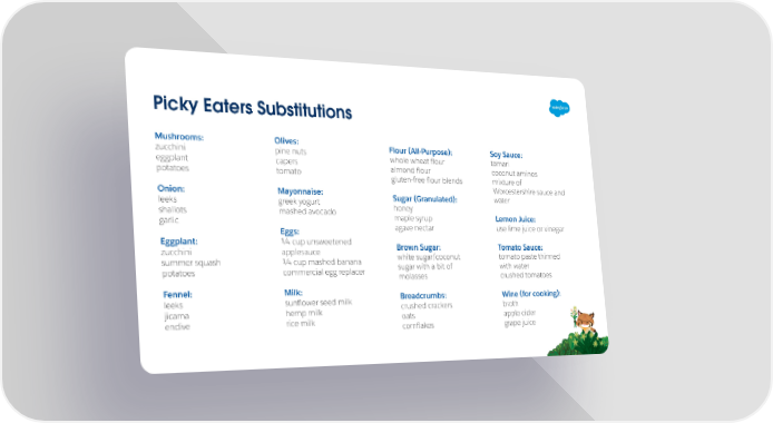 Picky Eaters Substitutions Mushrooms: Olives: Flour (All-Purpose): Soy Sauce: zucchini pine nuts whole wheat üour tamari eggplant capers almond üour coconut aminos potatoes tomato gluten-free üour blends mixture of Worcestershire sauce and Onion: Mayonnaise: Sugar (Granulated): water leeks greek yogurt honey shallots mashed avocado maple syrup Lemon Juice: garlic agave nectar use lime juice or vinegar Eggs: Eggplant: ¼ cup unsweetened Brown Sugar: Tomato Sauce: zucchini applesauce white sugar/coconut tomato paste thinned summer squash ¼ cup mashed banana sugar with a bit of with water potatoes commercial egg replacer molasses crushed tomatoes Fennel: Milk: Breadcrumbs: Wine (for cooking): leeks sunüower seed milk crushed crackers broth jicama hemp milk oats apple cider endive rice milk cornüakes grape juice