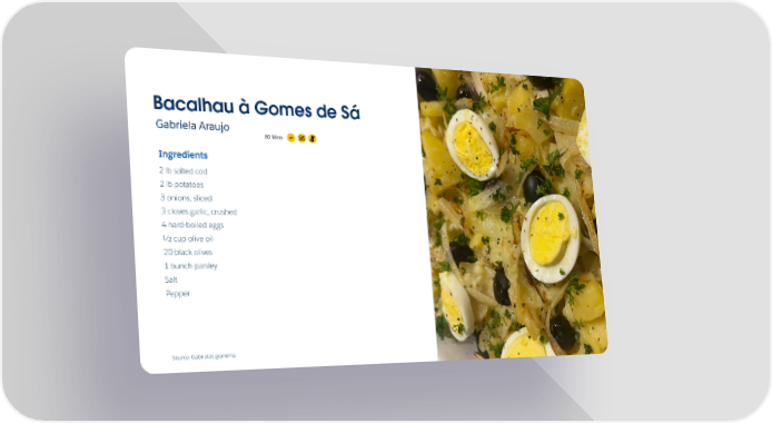 Bacalhau à Gomes de Sá Gabriela Araujo GF 80 Mins Ingredients 2 lb salted cod 2 lb potatoes 3 onions, sliced 3 cloves garlic, crushed Image 4 hard-boiled eggs ½ cup olive oil 20 black olives 1 bunch parsley Salt Pepper Source: Gabriela9s grandma