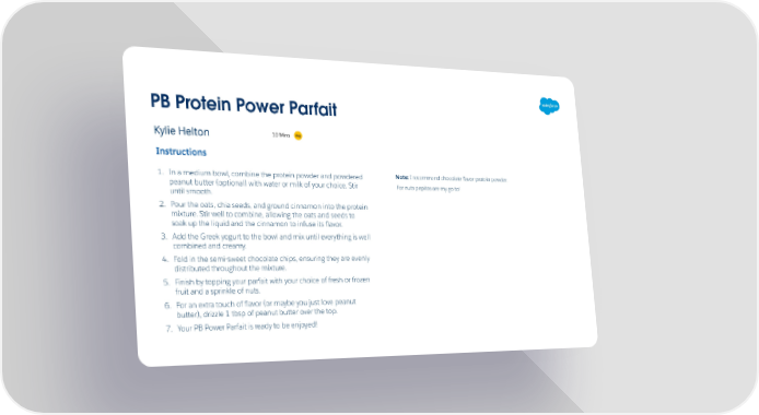 PB Protein Power Parfait Veg 10 Mins Kylie Helton Instructions Note: I recommend chocolate üavor protein powder. 1. In a medium bowl, combine the protein powder and powdered peanut butter (optional) with water or milk of your choice. Stir For nuts pepitas are my go-to! until smooth. 2. Pour the oats, chia seeds, and ground cinnamon into the protein mixture. Stir well to combine, allowing the oats and seeds to soak up the liquid and the cinnamon to infuse its üavor. 3. Add the Greek yogurt to the bowl and mix until everything is well combined and creamy. 4. Fold in the semi-sweet chocolate chips, ensuring they are evenly distributed throughout the mixture. 5. Finish by topping your parfait with your choice of fresh or frozen fruit and a sprinkle of nuts. 6. For an extra touch of üavor (or maybe you just love peanut butter), drizzle 1 tbsp of peanut butter over the top. 7. Your PB Power Parfait is ready to be enjoyed!