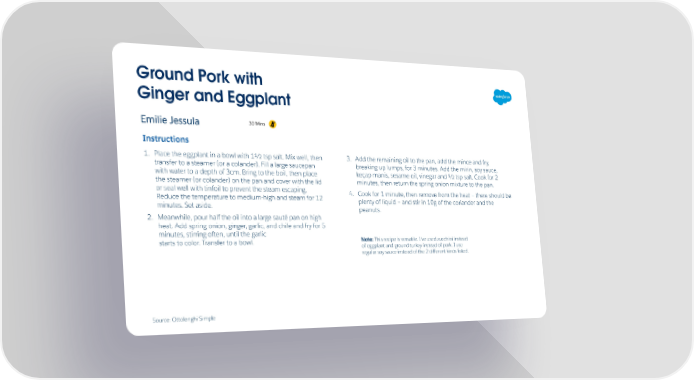 Ground Pork with Ginger and Eggplant 30 Mins Emilie Jessula Instructions 1. Place the eggplant in a bowl with 1½ tsp salt. Mix well, then 3. Add the remaining oil to the pan, add the mince and fry, transfer to a steamer (or a colander). Fill a large saucepan breaking up lumps, for 3 minutes. Add the mirin, soy sauce, with water to a depth of 3cm. Bring to the boil, then place keçap manis, sesame oil, vinegar and ½ tsp salt. Cook for 2 the steamer (or colander) on the pan and cover with the lid minutes, then return the spring onion mixture to the pan. or seal well with tinfoil to prevent the steam escaping. 4. Cook for 1 minute, then remove from the heat 3 there should be Reduce the temperature to medium-high and steam for 12 plenty of liquid 3 and stir in 10g of the coriander and the minutes. Set aside. peanuts. 2. Meanwhile, pour half the oil into a large sauté pan on high heat. Add spring onion, ginger, garlic, and chile and fry for 5 minutes, stirring often, until the garlic Note: This recipe is versatile. I've used zucchini instead starts to color. Transfer to a bowl. of eggplant and ground turkey instead of pork. I use regular soy sauce instead of the 2 diûerent kinds listed. Source: Ottolenghi Simple