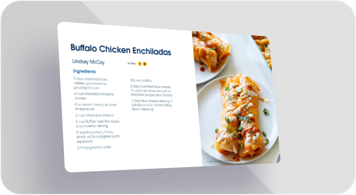 Buûalo Chicken Enchiladas GF 40 Mins Lindsay McCoy Ingredients 3 tbsp unsalted butter, 16 corn tortillas melted, plus more for 2 tbsp crumbled blue cheese greasing the pan (I substitute same amount of 4 cups shredded rotisserie shredded pepper jack cheese) chicken 2 tbsp blue cheese dressing (I 8 oz cream cheese, at room substitute with Hidden Valley temperature Ranch dressing) 2 cups shredded cheddar 1 cup Buûalo-style hot sauce, plus more for serving 1 bunch scallions, thinly sliced, white and green parts separated 1/4 tsp ground cumin Image source Food Network