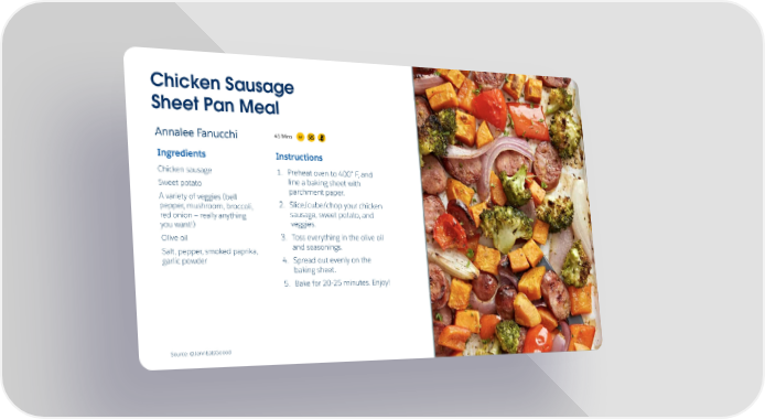 Chicken Sausage Sheet Pan Meal GF 45 Mins Annalee Fanucchi Ingredients Instructions Chicken sausage 1. Preheat oven to 400° F, and line a baking sheet with Sweet potato parchment paper. A variety of veggies (bell 2. Slice/cube/chop your chicken pepper, mushroom, broccoli, Image sausage, sweet potato, and red onion 4 really anything veggies. you want!) 3. Toss everything in the olive oil Olive oil and seasonings. Salt, pepper, smoked paprika, garlic powder 4. Spread out evenly on the baking sheet. 5. Bake for 20-25 minutes. Enjoy! Source: @JennEatsGoood
