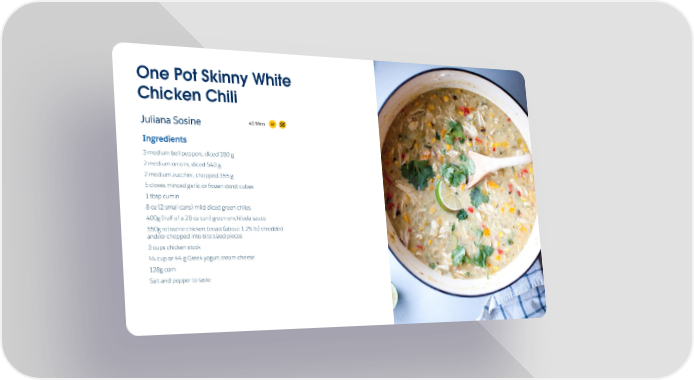 One Pot Skinny White Chicken Chili GF 40 Mins Juliana Sosine Ingredients 3 medium bell peppers, diced 380 g 2 medium onions, diced 540 g 2 medium zucchini, chopped 355 g 5 cloves minced garlic or frozen dorot cubes 1 tbsp cumin 8 oz (2 small cans) mild diced green chiles 400g (half of a 28 oz can) green enchilada sauce 550g rotisserie chicken breast (about 1.25 lb) shredded Source: Melissa9s brain and/or chopped into bite sized pieces 3 cups chicken stock ¼ cup or 44 g Greek yogurt cream cheese 128g corn Note: information Salt and pepper to taste