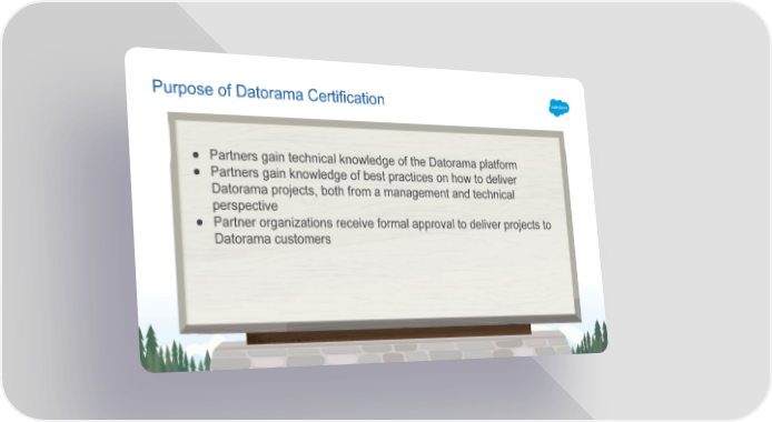 Purpose of Datorama Certification ● Partners gain technical knowledge of the Datorama platform ● Partners gain knowledge of best practices on how to deliver Datorama projects, both from a management and technical perspective ● Partner organizations receive formal approval to deliver projects to Datorama customers