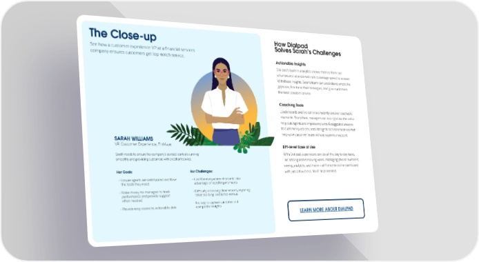 The Close-up How Dialpad Solves Sarah’s Challenges See how a customer experience VP at a financial services company ensures customers get top-notch service. Actionable Insights Dialpad’s built-in analytics shows metrics from call volumes and abandoned calls to average speed-to-answer. With these insights, Sarah’s team can understand where the gaps are, fine-tune their strategies, and give customers the best possible service. Coaching Tools Leaderboards and live call views instantly uncover coachable moments. From there, managers can hop right into the call to help out. Agents are empowered with AI-suggested answers to customer questions, and intelligent recommendations that help solve customer issues without supervisor support. SARAH WILLIAMS VP, Customer Experience, FinMaze DIY-level Ease of Use Sarah needs to ensure her company’s contact center is running With Dialpad, supervisors can do all the day-to-day tasks, smoothly and providing customers with excellent service. like adding and removing users, managing phone numbers, seeing analytics, and more — all from the online dashboard Her Goals: Her Challenges: with just a few clicks. No IT help needed. - Ensure agents are well-trained and have - Can’t be everywhere at once to take the tools they need advantage of coaching moments - Make it easy for managers to track - Difficulty accessing clean reports, reporting performance and provide support takes too long, and is too manual when needed - No way to capture customer and - Provide easy access to actionable data competitor insights LEARN MORE ABOUT DIALPAD