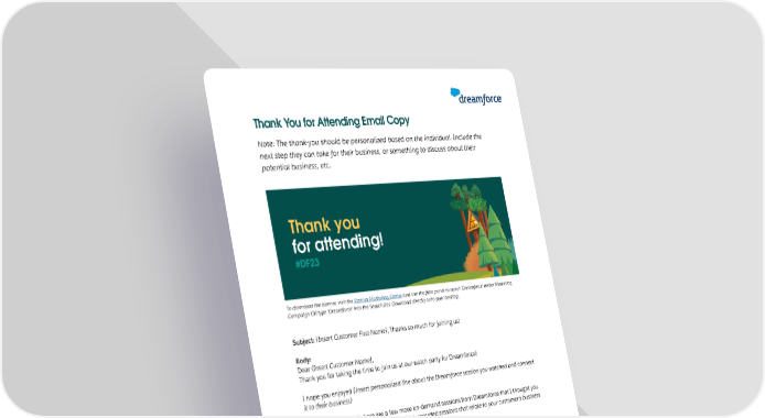 Thank You for Attending Email Copy Note: The thank-you should be personalized based on the individual. Include the next step they can take for their business, or something to discuss about their potential business, etc. To download the banner, visit the Partner Marketing Center and use the 昀椀lter panel to select ‘Dreamforce’ under Marketing Campaign OR type ‘Dreamforce’ into the Search Bar. Download directly onto your desktop. Subject: (Insert Customer First Name), Thanks so much for joining us! Body: Dear (Insert Customer Name), Thank you for taking the time to join us at our watch party for Dreamforce! I hope you enjoyed (Insert personalized line about the Dreamforce session you watched and connect it to their business) In case you missed it, here are a few more on-demand sessions from Dreamforce that I thought you might be interested in on Salesforce+: (Link recorded sessions that relate to your customer’s business needs and a brief sentence about why) If you have any questions or want to dive deeper into the topics we watched, just reply to this email and we can schedule a 1-on-1 meeting this week. Looking forward to speaking with you soon! Best, (Your Name) (Your Contact Info) Copyright © 2023 Salesforce.com, inc. All rights reserved. For Partner’s internal use only. 7