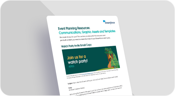Event Planning Resources: Communications, Graphic Assets and Templates We made it easy for you! This section provides all of the resources and pre-built content you need to make the most of your Dreamforce watch party. Watch Party Invite Email Copy To download the banner, visit the Partner Marketing Center and use the 昀椀lter panel to select ‘Dreamforce’ under Marketing Campaign OR type ‘Dreamforce’ into the Search Bar. Download directly onto your desktop. Subject: Don’t miss the AI event of the year. Join us (Insert Date) for an exclusive watch party! Body: Hi (Insert Customer Name), Let us bring the AI event of the year to you! Join us for an exclusive experience of Dreamforce 2023. We’re hosting a watch party on (Insert Date) to spread the AI magic, learn, connect, and have fun. Watch Party Details: (Bullet points describing your event) • Date and time • Address (Or include virtual meeting details if remote) • Mention food (Or “Order lunch on us” if remote) What we’re watching: (Use a brief description of the session you will stream taken from Dreamforce agenda) If you haven’t yet, be sure to register for Dreamforce on Salesforce+. We can’t wait to see you! (Add the call to action to get a speci昀椀c RSVP response) Sincerely, (Your Name) (Your Contact Info) Copyright © 2023 Salesforce.com, inc. All rights reserved. For Partner’s internal use only. 6