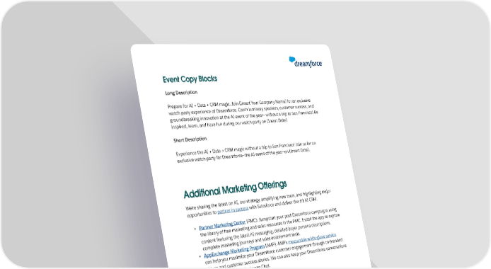 Event Copy Blocks Long Description Prepare for AI + Data + CRM magic. Join (Insert Your Company Name) for an exclusive watch party experience of Dreamforce. Catch luminary speakers, customer success, and groundbreaking innovation at the AI event of the year— without a trip to San Francisco! Be inspired, learn, and have fun during our watch party on (Insert Date). Short Description Experience the AI + Data + CRM magic without a trip to San Francisco! Join us for an exclusive watch party for Dreamforce—the AI event of the year—on (Insert Date). Additional Marketing O昀昀erings We’re sharing the latest on AI, our strategy, amplifying new tools, and highlighting major opportunities to partner in success with Salesforce and deliver the #1 AI CRM. • Partner Marketing Center (PMC): Jumpstart your post-Dreamforce campaigns using the library of free marketing and sales resources in the PMC. Install the app to explore content featuring the latest AI messaging, detailed buyer persona descriptions, complete marketing journeys and sales enablement tools. • AppExchange Marketing Program (AMP): AMP’s measurable white-glove service can help you maximize your Dreamforce customer engagement through co-branded videos and customer success stories. We can also keep your Dreamforce conversations 昀氀owing through AppExchange Chat. Copyright © 2023 Salesforce.com, inc. All rights reserved. For Partner’s internal use only. 9
