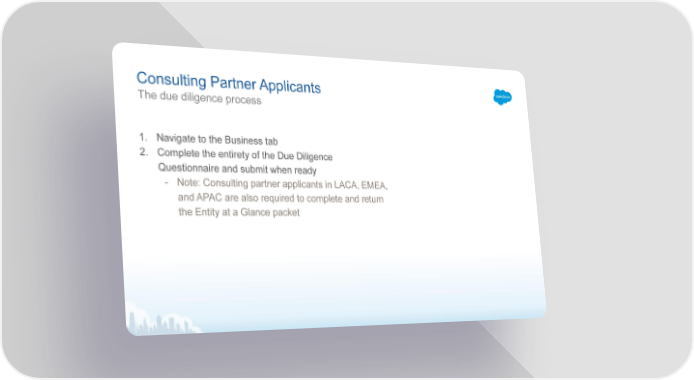 Consulting Partner Applicants The due diligence process 1. Navigate to the Business tab 2. Complete the entirety of the Due Diligence Questionnaire and submit when ready - Note: Consulting partner applicants in LACA, EMEA, and APAC are also required to complete and return the Entity at a Glance packet