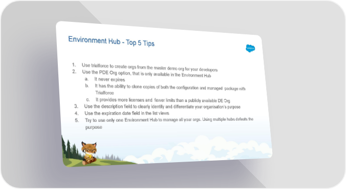 Environment Hub - Top 5 Tips 1. Use trialforce to create orgs from the master demo org for your developers 2. Use the PDE Org option, that is only available in the Environment Hub a. It never expires b. It has the ability to clone copies of both the configuration and managed package with Trialforce c. It provides more licenses and fewer limits than a publicly available DE Org 3. Use the description field to clearly identify and differentiate your organisation’s purpose 4. Use the expiration date field in the list views 5. Try to use only one Environment Hub to manage all your orgs. Using multiple hubs defeats the purpose