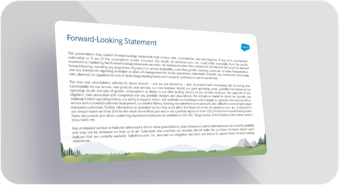 Forward-Looking Statement This presentation may contain forward-looking statements that involve risks, uncertainties, and assumptions. If any such uncertainties materialize or if any of the assumptions proves incorrect, the results of salesforce.com, inc. could differ materially from the results expressed or implied by the forward-looking statements we make. All statements other than statements of historical fact could be deemed forward-looking, including any projections of product or service availability, subscriber growth, earnings, revenues, or other financial items and any statements regarding strategies or plans of management for future operations, statements of belief, any statements concerning new, planned, or upgraded services or technology developments and customer contracts or use of our services. The risks and uncertainties referred to above include – but are not limited to – risks associated with developing and delivering new functionality for our service, new products and services, our new business model, our past operating losses, possible fluctuations in our operating results and rate of growth, interruptions or delays in our Web hosting, breach of our security measures, the outcome of any litigation, risks associated with completed and any possible mergers and acquisitions, the immature market in which we operate, our relatively limited operating history, our ability to expand, retain, and motivate our employees and manage our growth, new releases of our service and successful customer deployment, our limited history reselling non-salesforce.com products, and utilization and selling to larger enterprise customers. Further information on potential factors that could affect the financial results of salesforce.com, inc. is included in our annual report on Form 10-K for the most recent fiscal year and in our quarterly report on Form 10-Q for the most recent fiscal quarter. These documents and others containing important disclosures are available on the SEC Filings section of the Investor Information section of our Web site. Any unreleased services or features referenced in this or other presentations, press releases or public statements are not currently available and may not be delivered on time or at all. Customers who purchase our services should make the purchase decisions based upon features that are currently available. Salesforce.com, inc. assumes no obligation and does not intend to update these forward-looking statements.