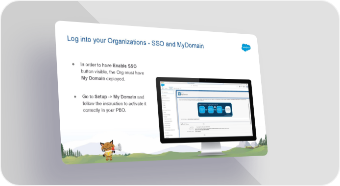 Log into your Organizations - SSO and MyDomain ● In order to have Enable SSO button visible, the Org must have My Domain deployed. ● Go to Setup -> My Domain and follow the instruction to activate it correctly in your PBO.