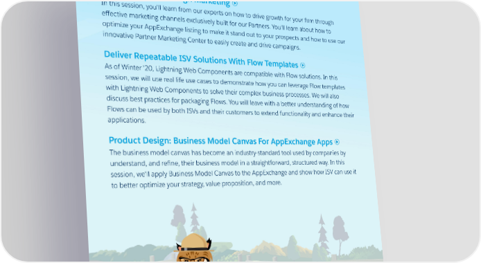 Driving Growth Through Marketing In this session, you'll learn from our experts on how to drive growth for your firm through effective marketing channels exclusively built for our Partners. You'll learn about how to optimize your AppExchange listing to make it stand out to your prospects and how to use our innovative Partner Marketing Center to easily create and drive campaigns. Deliver Repeatable ISV Solutions With Flow Templates As of Winter '20, Lightning Web Components are compatible with Flow solutions. In this session, we will use real life use cases to demonstrate how you can leverage Flow templates with Lightning Web Components to solve their complex business processes. We will also discuss best practices for packaging Flows. You will leave with a better understanding of how Flows can be used by both ISVs and their customers to extend functionality and enhance their applications. Product Design: Business Model Canvas For AppExchange Apps The business model canvas has become an industry-standard tool used by companies by understand, and refine, their business model in a straightforward, structured way. In this session, we'll apply Business Model Canvas to the AppExchange and show how ISV can use it to better optimize your strategy, value proposition, and more. 10 11