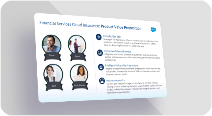 Financial Services Cloud Insurance: Product Value Proposition Policyholder 360 Reimagine the Agent as an Advisor. A holistic view of customers, their needs and relationships as well as policies and interactions set the stage for delivering insurance in a whole new way Connected Sales and Service Integrated, end to end processes to quote new business, maintain Carrier Agent existing policies and report claims eliminating swivel chair and process inefficiencies Intelligent Policyholder Interactions Insights drive prioritization of leads and proactive reach-outs creating policyholder journeys that are most likely to drive new business and increase customer loyalty Insurance Analytics CSR Policyholder Carriers gain insights into agents most likely to sell their products helping to focus marketing and agent support spend. Agents discover insights to help them deepen relationships with policyholders and identify new opportunities.