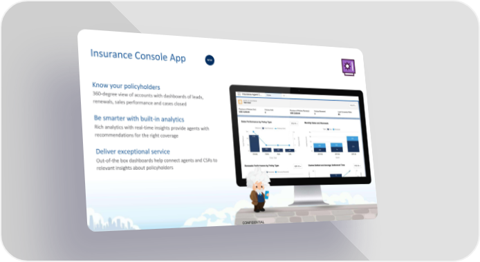 Insurance Console App NEW Know your policyholders 360-degree view of accounts with dashboards of leads, renewals, sales performance and cases closed Be smarter with built-in analytics Rich analytics with real-time insights provide agents with recommendations for the right coverage Deliver exceptional service Out-of-the box dashboards help connect agents and CSRs to relevant insights about policyholders CONFIDENTIAL