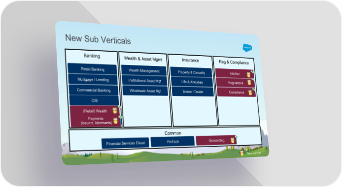 New Sub Verticals Banking Wealth & Asset Mgmt Insurance Reg & Compliance Retail Banking Wealth Management Property & Casualty InfoSec Mortgage / Lending Institutional Asset Mgt Life & Annuities Regulations Commercial Banking Wholesale Asset Mgt Broker / Dealer Compliance CIB (Retail) Wealth Payments [Issuers, Merchants] Common Financial Services Cloud FinTech Onboarding New in FY20