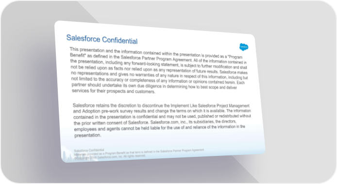 Salesforce Confidential This presentation and the information contained within the presentation is provided as a "Program Benefit" as defined in the Salesforce Partner Program Agreement. All of the information contained in the presentation, including any forward-looking statement, is subject to further modification and shall not be relied upon as facts nor relied upon as any representation of future results. Salesforce makes no representations and gives no warranties of any nature in respect of this information, including but not limited to the accuracy or completeness of any information or opinions contained herein. Each partner should undertake its own due diligence in determining how to best scope and deliver services for their prospects and customers. Salesforce retains the discretion to discontinue the Implement Like Salesforce Project Management and Adoption pre-work survey results and change the terms on which it is available. The information contained in the presentation is confidential and may not be used, published or redistributed without the prior written consent of Salesforce. Salesforce.com, inc., its subsidiaries, the directors, employees and agents cannot be held liable for the use of and reliance of the information in the presentation. Salesforce Confidential Materials provided as a Program Benefit as that term is defined in the Salesforce Partner Program Agreement ℗Copyright 2018 Salesforce.com, inc. All rights reserved.