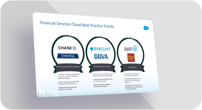 Financial Services Cloud Best Practice Trends One Team Around the Customer Personalization at Scale Compliance Visualization of client households (B2C) Personalization at the individual level x Faster speed-to-market allows for + accounts, and relationship groups millions of customers and households quicker response to regulators (B2B) all in one place Cross-LOB leads and referrals to unify Pre-integrated capabilities with ISV Common data model across all LOBs the customer experience partner ecosystem extending core driving operational efficiencies processes Digital transformation strategies Strong Centres of Excellence for beyond apps and websites Automating internal processes with visibility across all LOBs OOTB workflows and tracking for built- in regulatory validation