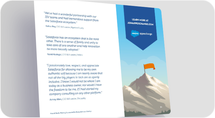“We’ve had a wonderful partnership with our Learn more at ISV teams and had tremendous support from JoinAppExchange.com the Salesforce ecosystem.” Katica Roy, CEO & Founder, Pipeline Equity “Salesforce has an ecosystem that is like none other. There is a sense of family and unity to take care of one another and help innovation be more broadly adopted.” Navid Rastegar, CEO & Founder, FitBliss “I passionately love, respect, and appreciate Salesforce for allowing me to be my own authentic self because I am keenly aware that not all the big players in tech are as openly inclusive. I know I would not be where I am today as a business owner, nor would I have the freedom to be me, if I had started my company consulting on any other platform.” Ashley Allen, CEO & Founder, ITequality How it Starts: Finding Success in the Ecosystem as a Startup 1414