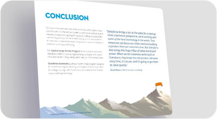 conclusion Startups continue to discover what’s possible and bring fresh ideas “Salesforce brings a ton to the table for a startup. and innovation to the tech ecosystem, pushing the rapid pace of an From a technical perspective, we’re working with industry already moving at lightning speed. Setting up yourself for some of the best technology in the world. That success by gaining access to the technology, tools, and expertise to become a customer-focused company can make the difference means we can focus our entire team on building between surviving and thriving. a product that our customers love. But Salesforce The AppExchange Partner Program helps anyone build on the also brings this huge influx of value and brand Salesforce Platform, sell on AppExchange, and grow with world- power. When we tell customers we’re built on class partner technology designed to help you do business faster. Salesforce, they know that the product will work every time, it’s secure, and it’s going to get them Salesforce Accelerate is a three-month virtual program designed to value quickly.” to provide the insights, learning, and support that startups need to strategically align with Salesforce and accelerate their time-to- David Bloom, CEO & Founder, LevelJump market with AppExchange. How it Starts: Finding Success in the Ecosystem as a Startup 1313