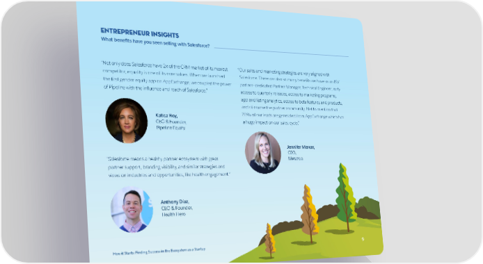 Entrepreneur Insights What benefits have you seen selling with Salesforce? “Not only does Salesforce have 2x of the CRM market of its nearest “Our sales and marketing strategies are very aligned with competitor, equality is one of its core values. When we launched Salesforce. There are also so many benefits we have as an ISV the first gender equity app on AppExchange, we coupled the power partner—dedicated Partner Manager, Technical Engineer, early of Pipeline with the influence and reach of Salesforce.” access to quarterly releases, access to marketing programs, app and listing analytics, access to beta features and products, and of course the partner community. Not to mention that Katica Roy, 70% of our leads are generated from AppExchange which has CEO & Founder, a huge impact on our sales cycle.” Pipeline Equity Jennifer Mercer, CEO, “Salesforce means a healthy partner ecosystem with great Metazoa partner support, branding visibility, and similar strategies and views on industries and opportunities, like health engagement.” Anthony Diaz, CEO & Founder, Health Hero How it Starts: Finding Success in the Ecosystem as a Startup 999