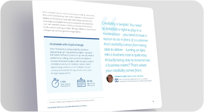 While a startup may be new to an industry or vertical, more often than not the entrepreneur behind the business is not new to the startup world. Call upon your past relationships, partnerships, Credibility is twofold. You need knowledge, accomplishments, and successes to help fast-track your new venture’s success. And if you are new to the startup to establish a right to play in a world, consider seeking a mentor. Hiring a skillful and experienced entrepreneur can help guide the organization. marketplace — you need to have a reason to be in front of a customer. Accelerate with AppExchange And credibility comes from being When it comes to building credibility, Salesforce able to deliver — turning an idea AppExchange can help lay the foundation. Access to into a business case is quite easy. the Salesforce Platform plus thorough security reviews and technical vetting means partners can focus on Actually being able to transmit into development and innovation, with increased solution credibility driven by the Salesforce network effect. a business metric? That’s where AppExchange partners see 4–10x faster product development and 30–60 days shorter sales cycles your credibility comes from. 2 to larger organizations . Richard Forsyth, Sales Director, SightCall 30–60 Watch to learn how SightCall builds trust and wins 4–10x customers in the financial services and insurance vertical. faster product days shorter development sales cycles 2 Guidebook: Salesforce AppExchange by Nucleus Research, released August 2018. How it Starts: Finding Success in the Ecosystem as a Startup 5