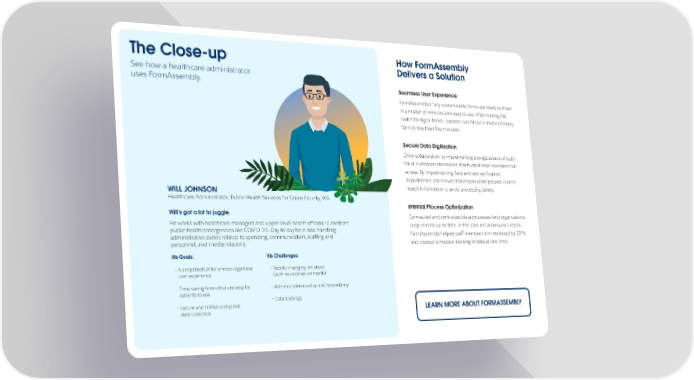 The Close-up How FormAssembly See how a healthcare administrator Delivers a Solution uses FormAssembly. Seamless User Experience FormAssembly’s fully customizable forms are ready to share in a matter of minutes and easy to use. After making the switch to digital forms, patients can 昀椀ll out a medical history form in less than 昀椀ve minutes. Secure Data Digitization Drive collaboration by implementing a single source of truth for all customer information that trusted team members can access. By implementing 昀椀eld and text veri昀椀cation, departments can ensure that respondents provide correct WILL JOHNSON health information to avoid processing delays. Healthcare Administrator, Public Health Services for Green County, WA Internal Process Optimization Will’s got a lot to juggle. Connected and centralized data processes help organizations He works with healthcare managers and upper-level health o昀케cials to confront public health emergencies like COVID-19. Day-to-day he is also handling keep records up to date. In the case of Continuum Clinical, FormAssembly helped sta昀昀 members trim workload by 20% administrative duties related to spending, communication, sta昀케ng and and cleanse a massive backlog of data at one time. personnel, and media relations. His Goals: His Challenges: - A simpli昀椀ed UX for a more organized - Rapidly changing initiatives user experience (such as vaccination needs) - Time-saving forms that are easy for - Administrative overlap and redundancy patients to use - Data backlogs - Secure and HIPAA compliant data collection LEARN MORE ABOUT FORMASSEMBLY