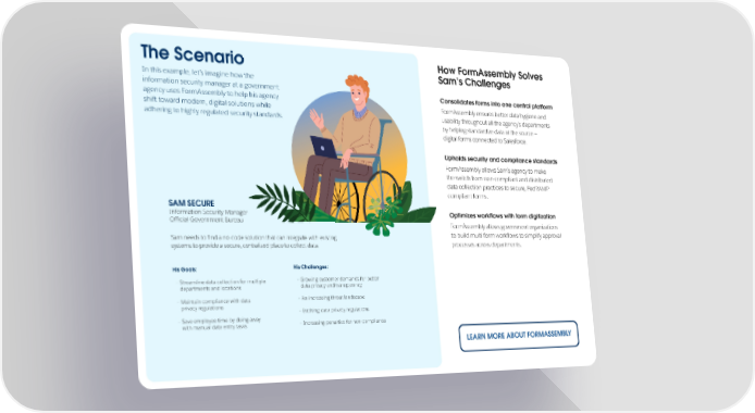 The Scenario How FormAssembly Solves Sam’s Challenges In this example, let’s imagine how the information security manager at a government Consolidates forms into one central platform agency uses FormAssembly to help his agency shift toward modern, digital solutions while FormAssembly ensures better data hygiene and adhering to highly regulated security standards. usability throughout all the agency’s departments by helping standardize data at the source — digital forms connected to Salesforce. Upholds security and compliance standards FormAssembly allows Sam’s agency to make the switch from non-compliant and distributed data collection practices to secure, FedRAMP- compliant forms. SAM SECURE Information Security Manager Optimizes workflows with form digitization Official Government Bureau FormAssembly allows government organizations Sam needs to find a no-code solution that can integrate with existing to build multi-form workflows to simplify approval systems to provide a secure, centralized place to collect data. processes across departments. His Goals: His Challenges: - Streamline data collection for multiple - Growing customer demands for better departments and locations data privacy and transparency - Maintain compliance with data - An increasing threat landscape privacy regulations - Evolving data privacy regulations - Save employee time by doing away with manual data entry tasks - Increasing penalties for non-compliance LEARN MORE ABOUT FORMASSEMBLY