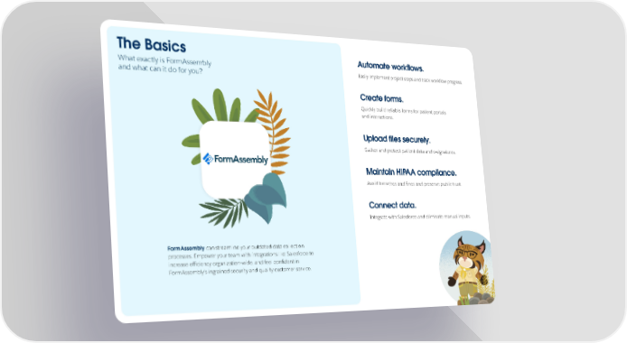 The Basics Automate workflows. What exactly is FormAssembly Easily implement project steps and track workflow progress. and what can it do for you? Create forms. Quickly build reliable forms for patient portals and interactions. Upload files securely. Gather and protect patient data and e-signatures. Maintain HIPAA compliance. Avoid breaches and fines and preserve public trust. Connect data. Integrate with Salesforce and eliminate manual inputs. FormAssembly can streamline your outdated data collection processes. Empower your team with integrations like Salesforce to increase efficiency organization-wide, and feel confident in FormAssembly’s ingrained security and quality customer service.