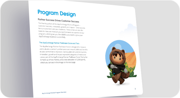 Program Design Partner Success Drives Customer Success The four key pillars of the AppExchange Partner Program — customer success, innovation, growth and impact — drive success for our customers and your business. These pillars are also the basis for how we measure your performance as a partner in our program, which gives you the visibility you need to grow your AppExchange business successfully. The AppExchange Partner Trailblazer Score and Tiers The AppExchange Partner Trailblazer Score is designed to measure and evaluate a partner’s performance and reward additional benefits as your performance improves. Our key pillars of customer success, innovation, growth and impact represent categories of metrics we use as part of the AppExchange Partner Trailblazer Score. Each pillar is made up of two metrics, and a total allocation of 1,000 points, which you can see in the image on the next page. AppExchange Partner Program Overview 33