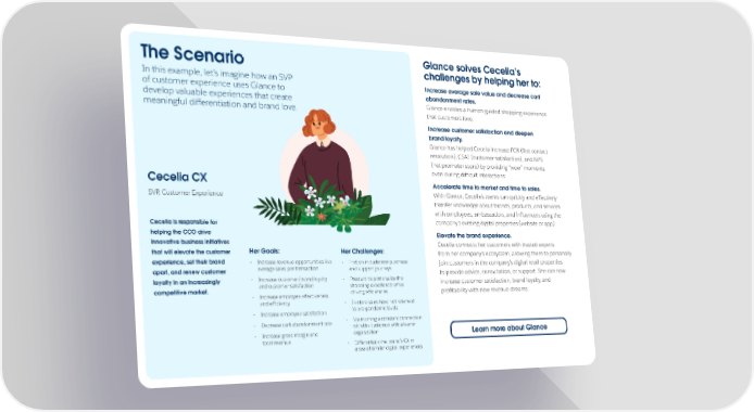 The Scenario Glance solves Cecelia’s challenges by helping her to: In this example, let’s imagine how an SVP Increase average sale value and decrease cart of customer experience uses Glance to abandonment rates. develop valuable experiences that create Glance enables a human-guided shopping experience meaningful differentiation and brand love. that customers love. Increase customer satisfaction and deepen brand loyalty. Glance has helped Cecelia increase FCR (first contact resolution), CSAT (customer satisfaction), and NPS (net promoter score) by providing “wow” moments even during difficult interactions. Cecelia CX Accelerate time to market and time to sales. SVP, Customer Experience With Glance, Cecelia’s teams can quickly and effectively transfer knowledge about brands, products, and services with employees, ambassadors, and influencers using the Cecelia is responsible for company’s existing digital properties (website or app). helping the CCO drive Elevate the brand experience. innovative business initiatives Cecelia connects her customers with trusted experts that will elevate the customer Her Goals: Her Challenges: from her company’s ecosystem, allowing them to personally experience, set their brand • Increase revenue opportunities like • Friction in customer purchase join customers in the company’s digital retail properties apart, and renew customer average sales per transaction and support journeys to provide advice, consultation, or support. She can now loyalty in an increasingly • Increase customer/brand loyalty • Pressure to personalize the increase customer satisfaction, brand loyalty, and competitive market. and customer satisfaction shopping experience while • Increase employee effectiveness driving efficiencies profitability with new revenue streams. and efficiency • In-store sales have not returned • Increase employee satisfaction to pre-pandemic levels • Decrease cart abandonment rate • Maintaining a constant connection with the customer with a leaner • Increase gross margin and organization Learn more about Glance total revenue • Differentiate the brand’s CX in a sea of similar digital experiences