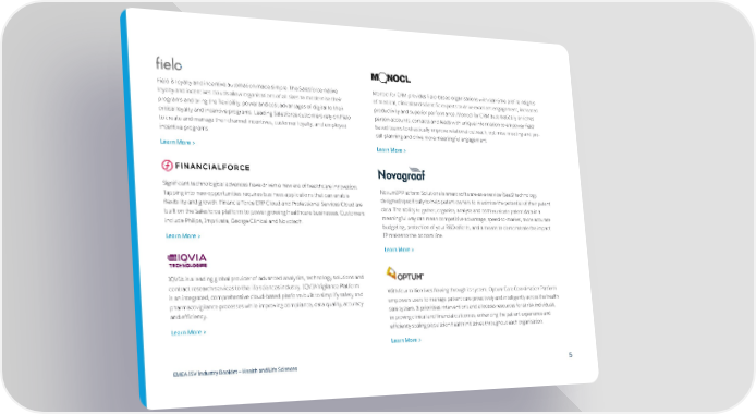 Fielo is loyalty and incentive automation made simple. The Salesforce-native Monocl for CRM provides field-based organisations with real-time profile insights loyalty and incentives clouds allow organisations of all sizes to modernise their of medical, clinical and scientific experts to drive excellent engagement, increased programs and bring the flexibility, power and cost advantages of digital to their productivity and superior performance. Monocl for CRM automatically enriches critical loyalty and incentive programs. Leading Salesforce customers rely on Fielo person accounts, contacts and leads with unique information to empower field- to create and manage their channel incentives, customer loyalty, and employee based teams to drastically improve relational outreach, optimise meeting and pre- incentive programs. call planning and drive more meaningful engagement. Learn More > Learn More > Significant technological advances have driven a new era of healthcare innovation. NovumIP Platform Solutions is smart software-as-a-service (SaaS) technology Tapping into new opportunities requires business applications that can enable designed specifically to help patent owners to maximise the potential of their patent flexibility and growth. FinancialForce ERP Cloud and Professional Services Cloud are data. The ability to gather, organise, analyse and communicate patent data in a built on the Salesforce platform to power growing healthcare businesses. Customers meaningful way can mean competitive advantage, speed-to-market, more accurate include Philips, Imprivata, George Clinical and Novotech. budgeting, protection of your R&D efforts, and a means to demonstrate the impact Learn More > IP makes to the bottom line. Learn More > IQVIA is a leading global provider of advanced analytics, technology solutions and contract research services to the life sciences industry. IQVIA Vigilance Platform is an integrated, comprehensive cloud-based platform built to simplify safety and With four million lives flowing through its system, Optum Care Coordination Platform pharmacovigilance processes while improving compliance, data quality, accuracy empowers users to manage patient care proactively and intelligently across the health and efficiency. care system. It prioritises interventions and allocates resources for at-risk individuals, improving clinical and financial outcomes, enhancing the patient experience and Learn More > efficiently scaling population health initiatives throughout each organisation. Learn More > EMEA ISV Industry Booklet — Health and Life Sciences 5