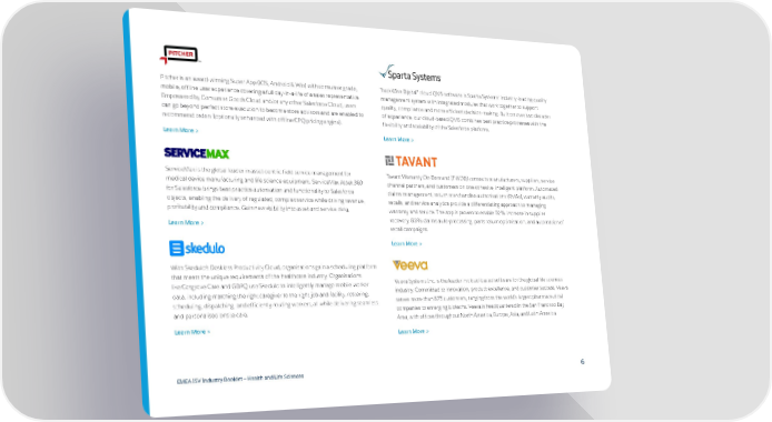 Pitcher is an award-winning Super App (iOS, Android & Win) with consumer grade, TrackWise Digital® cloud QMS software is Sparta Systems’ industry-leading quality mobile, offline user experience covering a full day-in-a-life of a sales representative. management system with integrated modules that work together to support Empowered by Consumer Goods Cloud and/or any other Salesforce Cloud, users quality, compliance and more efficient decision-making. Built on over two decades can go beyond perfect store execution to become store advisors and are enabled to of experience, our cloud-based QMS combines best practice processes with the recommend orders (optionally enhanced with offline CPQ pricing engine). flexibility and scalability of the Salesforce platform. Learn More > Learn More > ServiceMax is the global leader in asset-centric field service management for Tavant Warranty On-Demand (TWOD) connects manufacturers, suppliers, service medical device manufacturing and life science equipment. ServiceMax Asset 360 channel partners, and customers on one cohesive, intelligent platform. Automated for Salesforce brings best-practice automation and functionality to Salesforce claims management, return merchandise authorisations (RMAs), warranty audits, objects, enabling the delivery of regulated, complex service while driving revenue, recalls, and service analytics provide a differentiating approach to managing profitability and compliance. Gain new visibility into asset and service data. warranty and service. The app is proven to enable 50% increase in supplier Learn More > recovery, 85% claims auto-processing, parts return optimisation, and automation of recall campaigns. Learn More > With Skedulo’s Deskless Productivity Cloud, organisations gain a scheduling platform that meets the unique requirements of the healthcare industry. Organisations like Cosgrove Care and GDPQ use Skedulo to intelligently manage mobile worker Veeva Systems Inc. is the leader in cloud-based software for the global life sciences data, including matching the right caregiver to the right job and facility, rostering, industry. Committed to innovation, product excellence, and customer success, Veeva scheduling, dispatching, and efficiently routing workers, all while delivering seamless serves more than 875 customers, ranging from the world’s largest pharmaceutical and personalised onsite care. companies to emerging biotechs. Veeva is headquartered in the San Francisco Bay Area, with offices throughout North America, Europe, Asia, and Latin America. Learn More > Learn More > EMEA ISV Industry Booklet — Health and Life Sciences 6