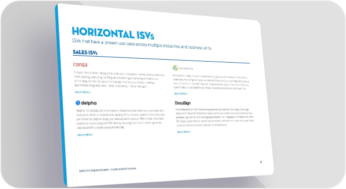 Horizontal ISVs ISVs that have a proven use case across multiple industries and business units Sales ISVs Conga offers solutions designed to make your company’s revenue more predictable. Docomotion makes it easier to automatically generate documents on Salesforce, From quoting, executing, fulfilling, and expanding or renewing contracts, our drastically improving both your business efficiency and your workday. Easily set up technology and holistic approach manage revenue as a lifecycle, making it one-click actions - no code required - to generate any type of document from any automated, integrated, and – most importantly – more intelligent. type of data, or use Salesforce’s inherent automation tools such as Visual Flow. Learn More > Learn More > Delpha is a DataOps solution native to Salesforce that offers both automatic and Automate and connect the entire agreement process with DocuSign. DocuSign manual solutions to improve data quality efficiently and easily for better SalesOps Agreement Cloud for Salesforce helps businesses connect and automate how they performance. Delpha helps your revenue teams recoup 70% of their time that’s prepare, sign, act on, and manage agreements — all integrated with Salesforce. With wasted on processing bad CRM data by allowing it to import, enrich, generate, DocuSign, organisations can do business faster with less risk, lower costs, and better cleanse and/or update data automatically. experiences for customers, partners, and employees. Learn More > Learn More > EMEA ISV Industry Booklet — Health and Life Sciences 88
