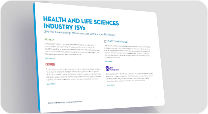 health and Life sciences s INDUSTRY ISV ISVs that have a strong, proven use case within a specific industry Axtria SalesIQ™ is the #1 commercial operations cloud product suite in the HLS Customertimes (CT) provides native Salesforce mobile and cloud solutions that help industry, supporting the global top 15 companies. Built on Force.com, Axtria medical and commercial reps to better engage with stakeholders. Designed for life SalesIQ™ streamlines commercial models and operations to deliver a fully integrated sciences companies and consumer health uses cases, our applications streamline product suite across territory alignment, call planning, incentive compensation, and processes and empower teams with standard and custom objects, CLM, remote field reporting and supports real-time updates to CRM. detailing, retail execution and order tracking to dramatically boost efficiency and increase their bottom line. Learn More > Learn More > Conga equips the entire HLS ecosystem with a rich set of revenue lifecycle solutions, including contract lifecycle management, document generation and e-signature. Life Sciences manufacturers utilise Conga to streamline pricing, contracting, billing, Dot Compliance offers the industry’s first ready-to-use Quality Management system and patient access operations. Healthcare organisations contract with providers and powered by the Salesforce platform. The Dot Compliance suite includes an extensive suppliers, and communicate important care information to patients/providers. set of off-the-shelf ready QMS and compliance pre-configured best practice Learn More > processes, enabling customers to deploy quickly and cost-effectively. Learn More > EMEA ISV Industry Booklet — Health and Life Sciences 4